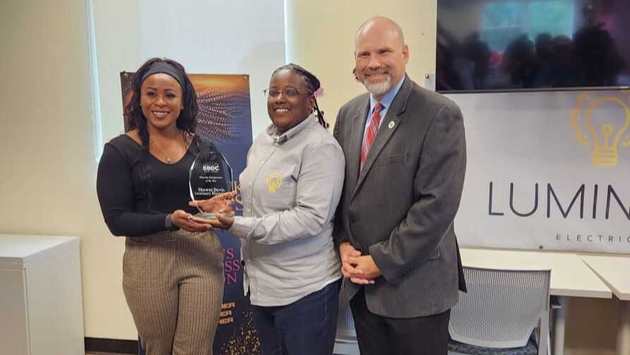 Shawni Davis, owner and operator of Luminary Electrical, received the New York State Small Business Development Center’s 2023 Minority Entrepreneur of the Year Award on Friday, September 29. She was presented the award by Sonya Smith, State Director of the New York Small Business Development Centers. Davis is a client of the Small Business Development Center at Onondaga Community College.